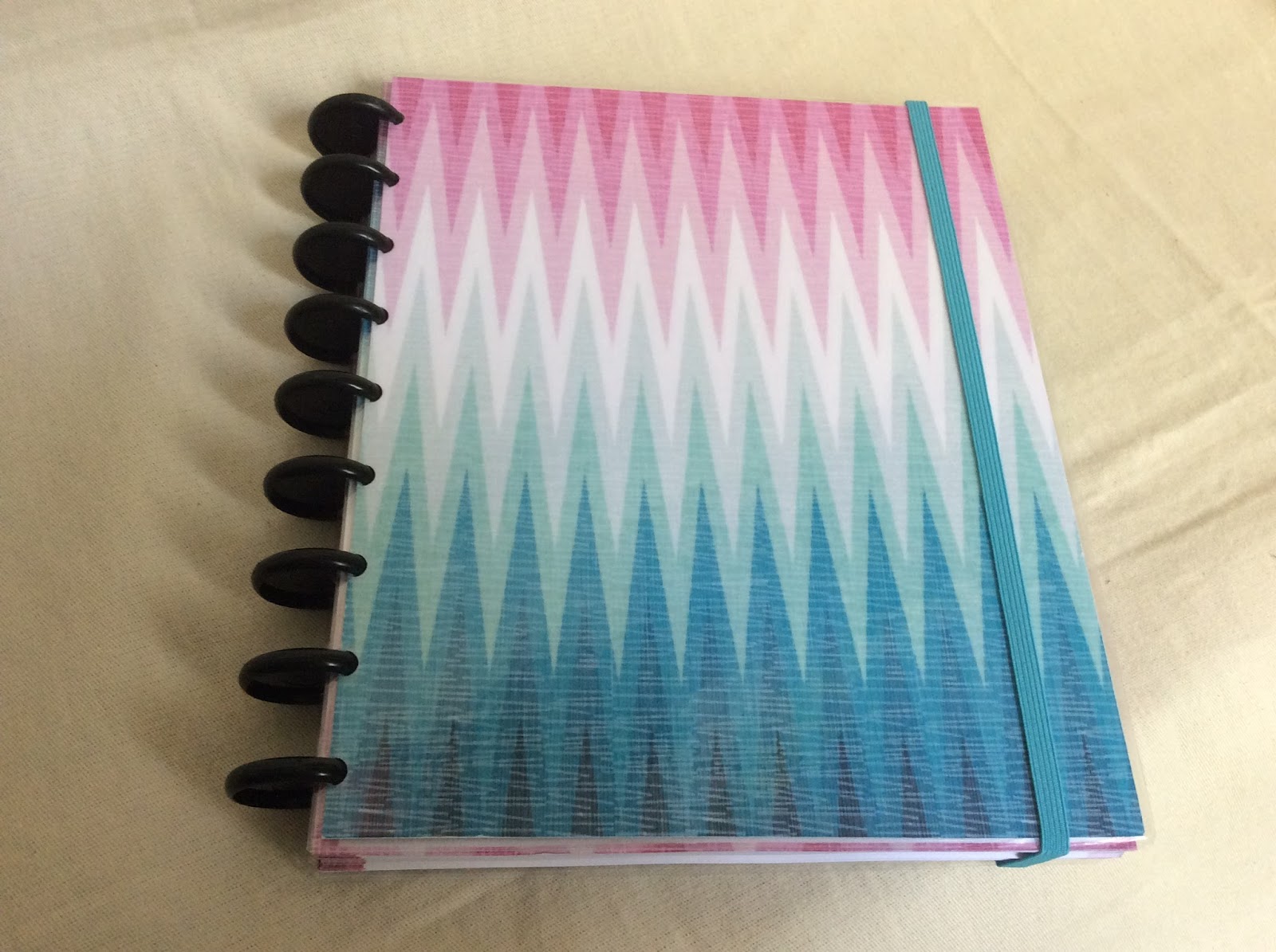 Caderno sistema de encadernação ARC, com capa colorida e plastificada, contendo 9 discos,
